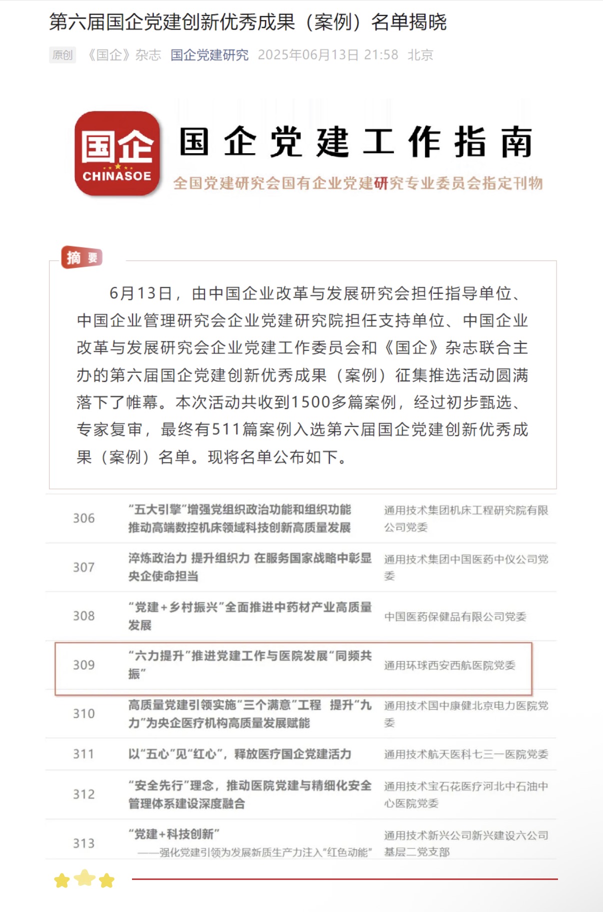 近日,由中国企业改革与发展研究会担任指导单位、中国企业管理研究会企业党建研究院担任支持单位、中国企业改革与发展研究会企业党建工作委员会和《国企》杂志联合主办的第六届国企党建创新优秀成果(案例)征集推选活动圆满落下了帷幕。西航医院《“六力提升”推进党建工作与医院发展“同频共振”》从1500余个案例中脱颖而出,经过初步甄选、专家复审,入选第六届国企党建创新优秀成果(案例)名单。