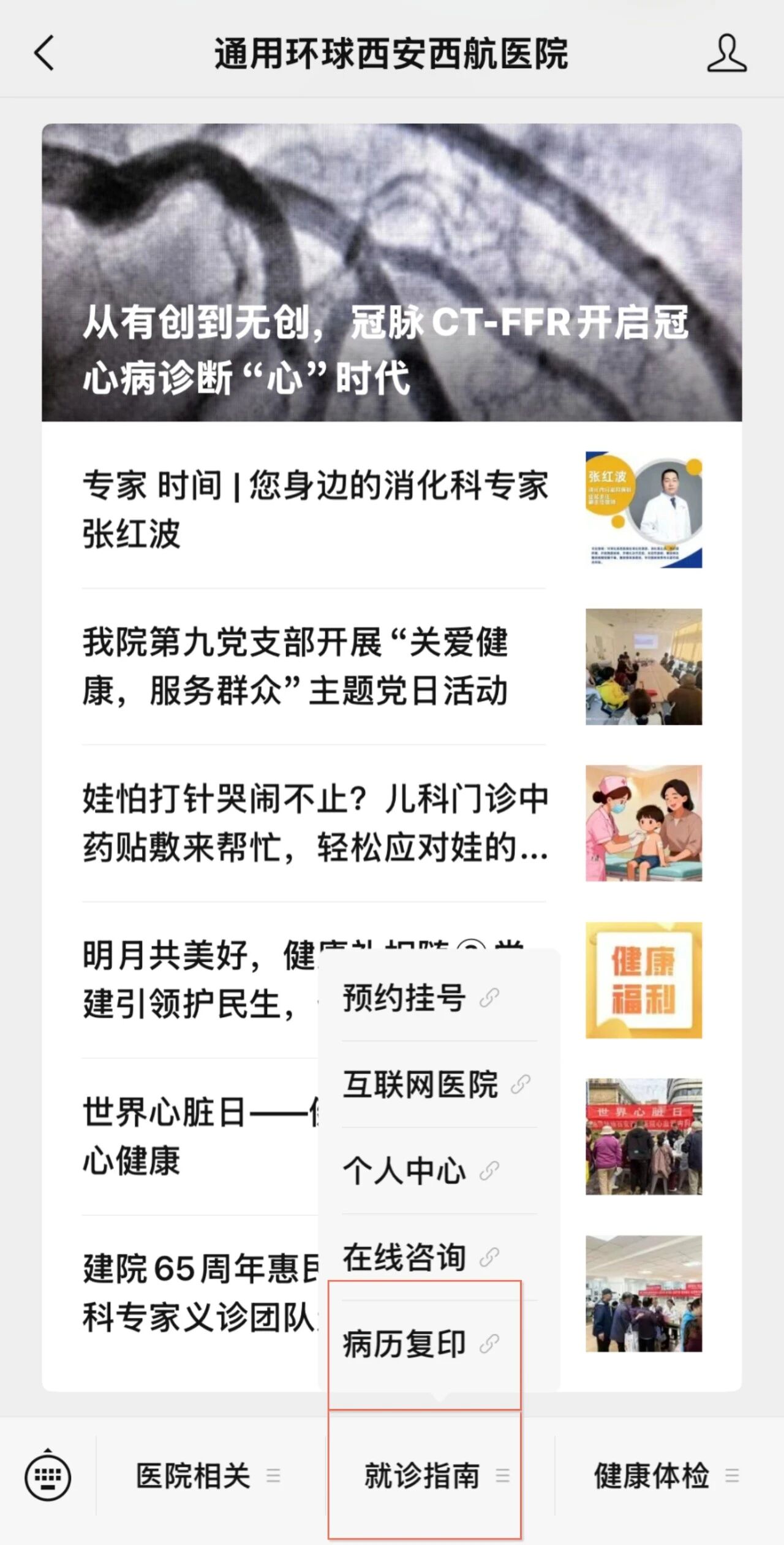 第二步:点击下拉菜单“就诊指南”,选择“病历复印”。