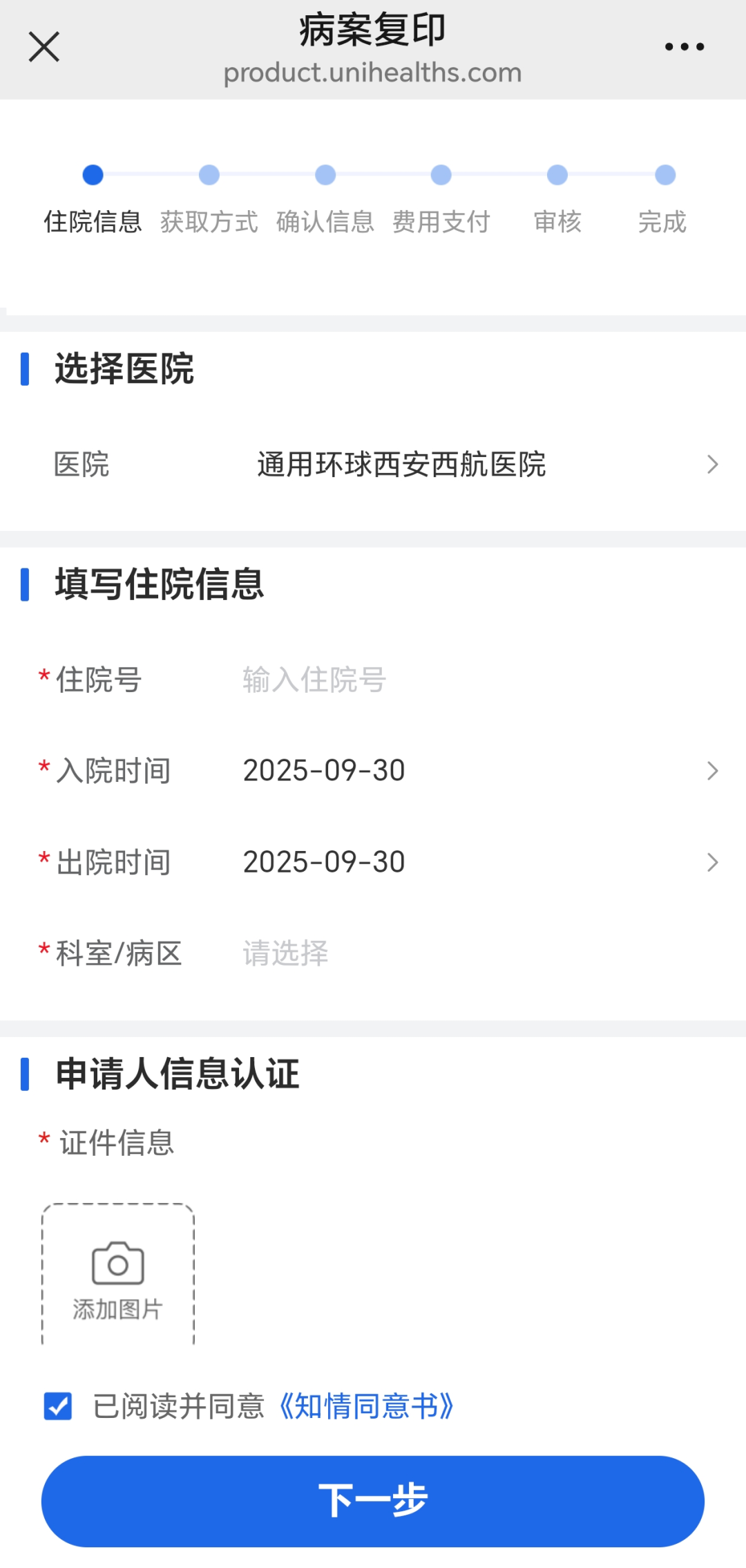 第四步:选择患者,填写住院信息,上传身份证正反面照片,点击下一步。(注意:如是儿童代办,须同时上传儿童户口本信息页或出生证,和监护人原件正反面)