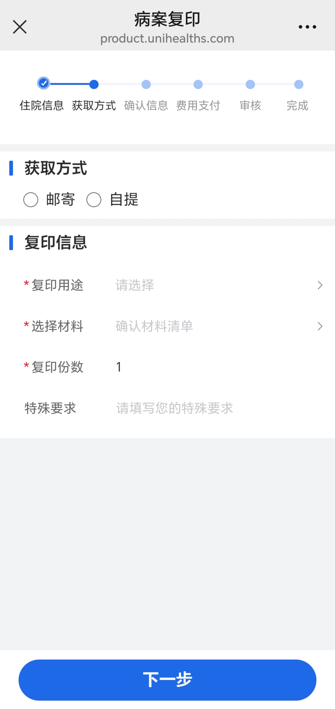 第五步:选择获取方式,填写复印信息,如需邮寄请填写配送地址,点击下一步。