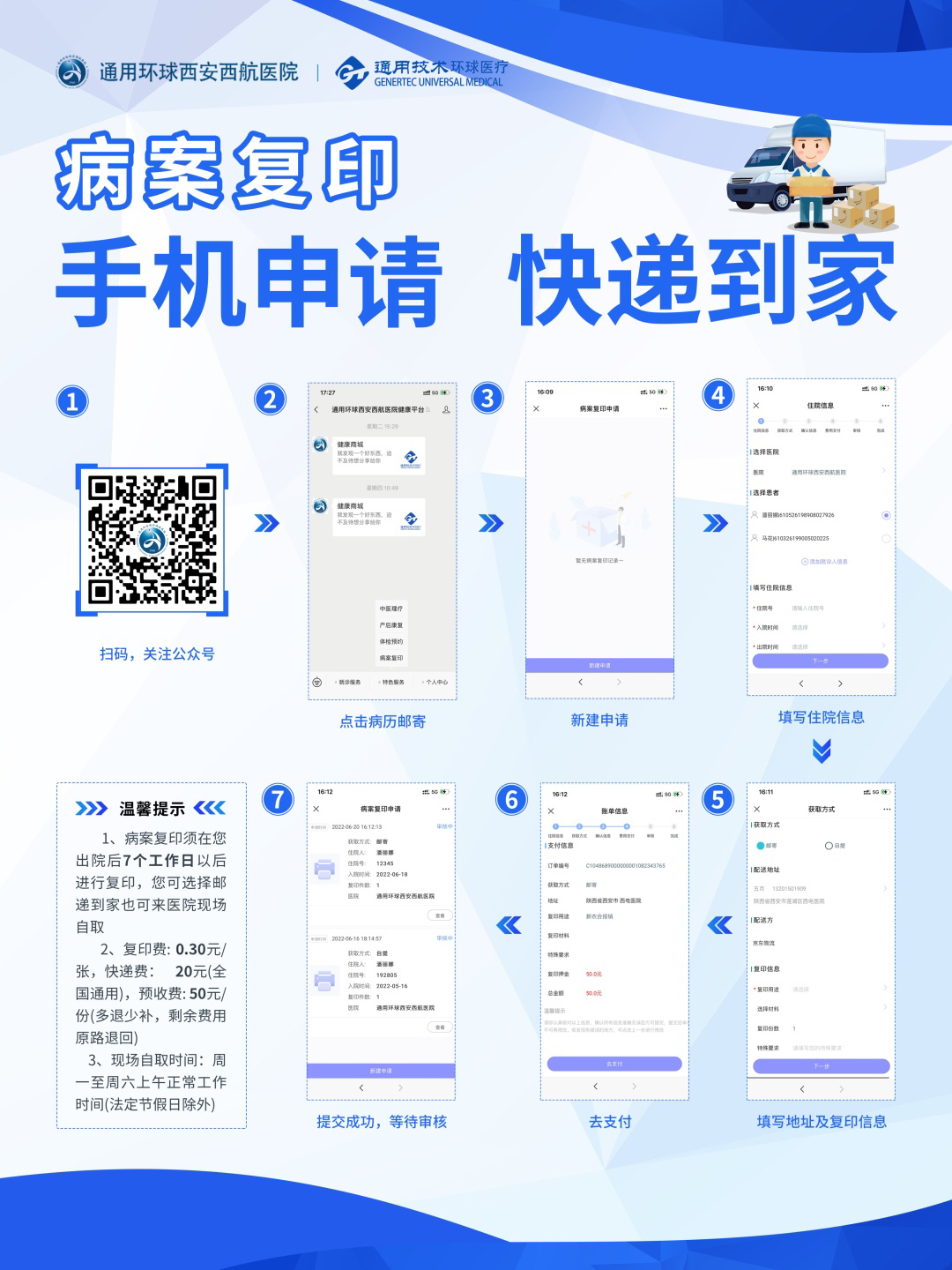 住院病案是包括医疗记录、护理记录、检验检查报告及各种证明的文件,也是患者复诊转诊、报销理赔的重要资料。为改善患者就医体验,更好地服务患者,通用环球西安西航医院已开通“病案预约邮寄到家”服务,患者足不出户,在家即可轻松预约病案邮寄到家服务,再也不用为往返医院、排队等待、办理资料而发愁,还能随时在手机上查询办理进度和寄送状态,具体申请步骤如下: