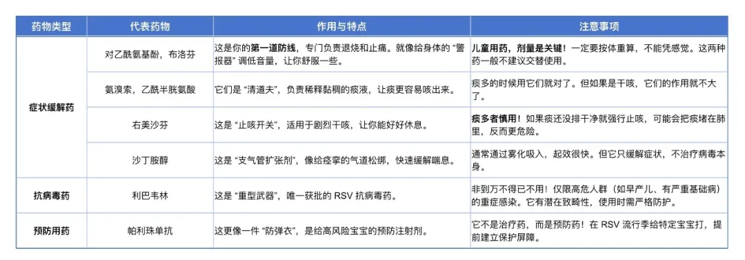 看清“适用人群”:特别是利巴韦林和帕利珠单抗,都有严格的使用限制。不是所有RSV感染都能用,一定要听医生的。
