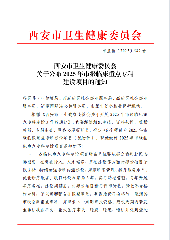 此次医院成功立项两个临床重点专科建设项目,标志着医院进一步在专科建设领域取得了更高的台阶。接下来,医院将紧密围绕市级临床重点专科建设的目标与要求,进一步加强学科建设,聚焦技术创新、人才培养和服务优化,持续提升核心竞争力,充分发挥临床重点专科的示范、引领和辐射作用,为辖区人民群众的生命健康提供更加坚实的保障,助力健康事业的蓬勃发展。
